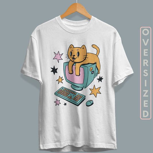 Computer Cat Cartoon Unisex Oversized T-Shirt